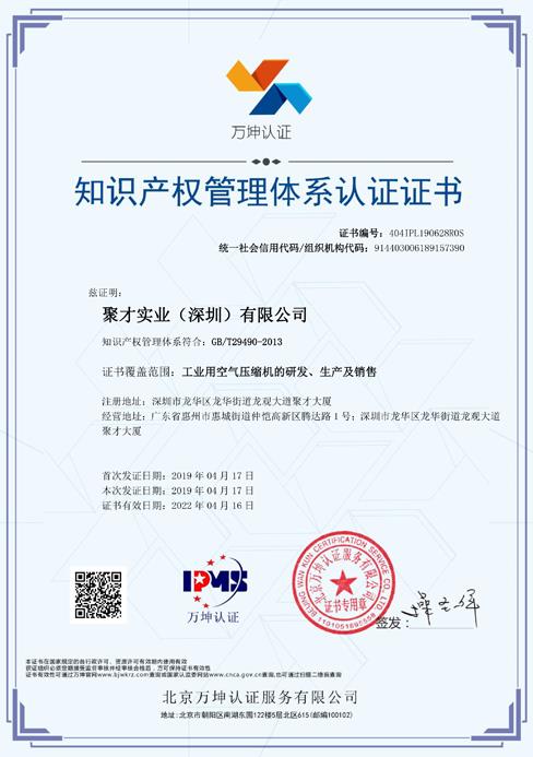Since Jucai Industrial (Shenzhen) Co., Ltd. was created, it has been committed to providing customers with full set of air compressing energy saving solution. At present, our company has more than 50 patents. In order to further protect scientific research products, we currently need a set of full intellectual property management system to escort technological innovation. During the 2 days' rigorous audit, the relative work of our intellectual property management got the recognition of auditor and passed the relative requirements of enterprise intellectual property management standards.