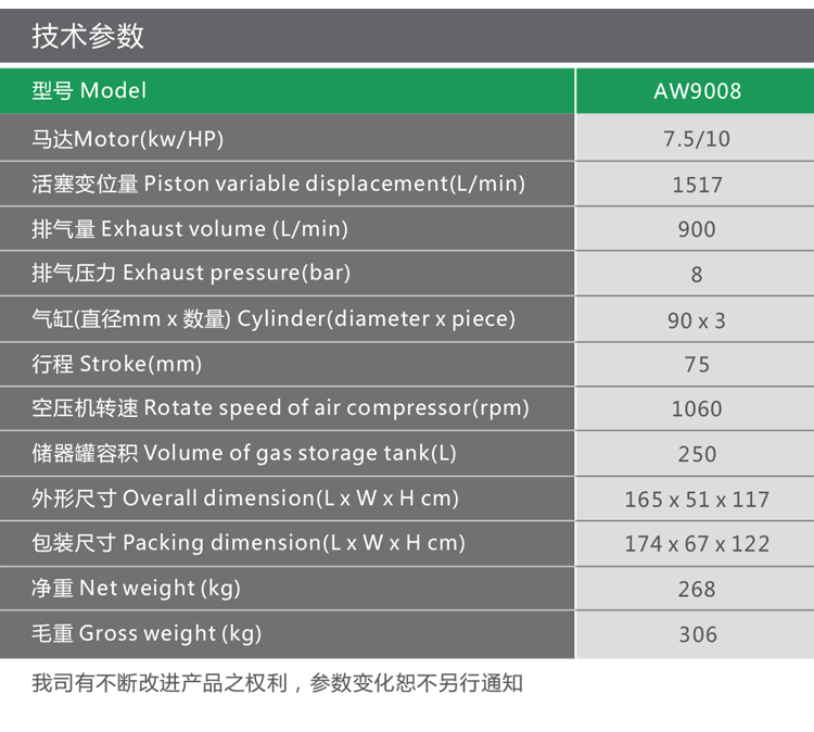 產品名稱:7.5kW,8bar新型節能環保活塞式空壓機AW9008