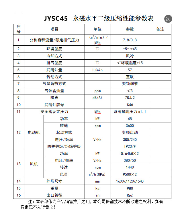 產(chǎn)品名稱:45kW 水平雙級直連永磁變頻空壓機(jī) JYSC45